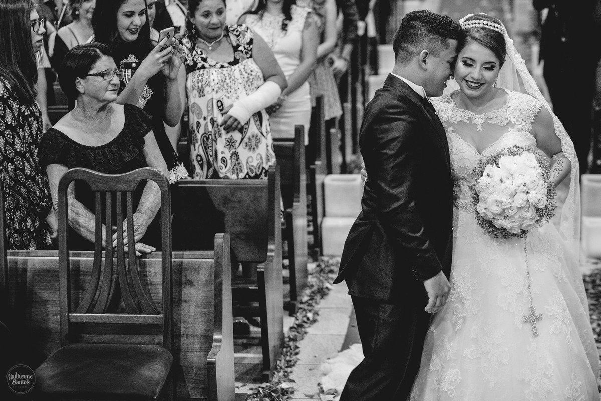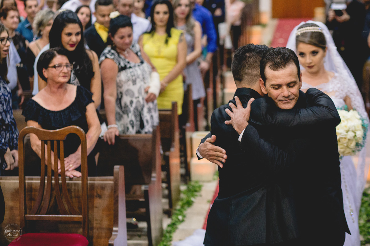 Fotografia de casamento pelo fotógrafo Guilherme Santos, noiva chegando na igreja com o pai