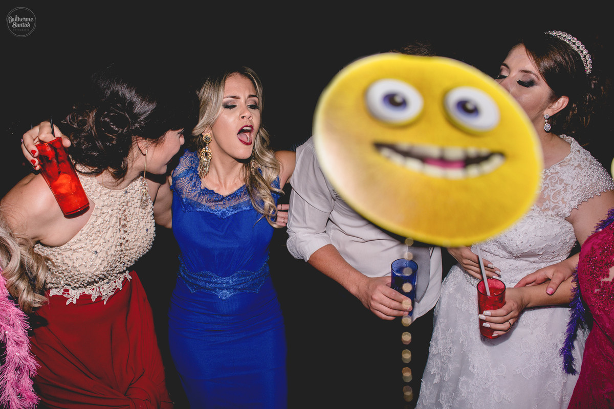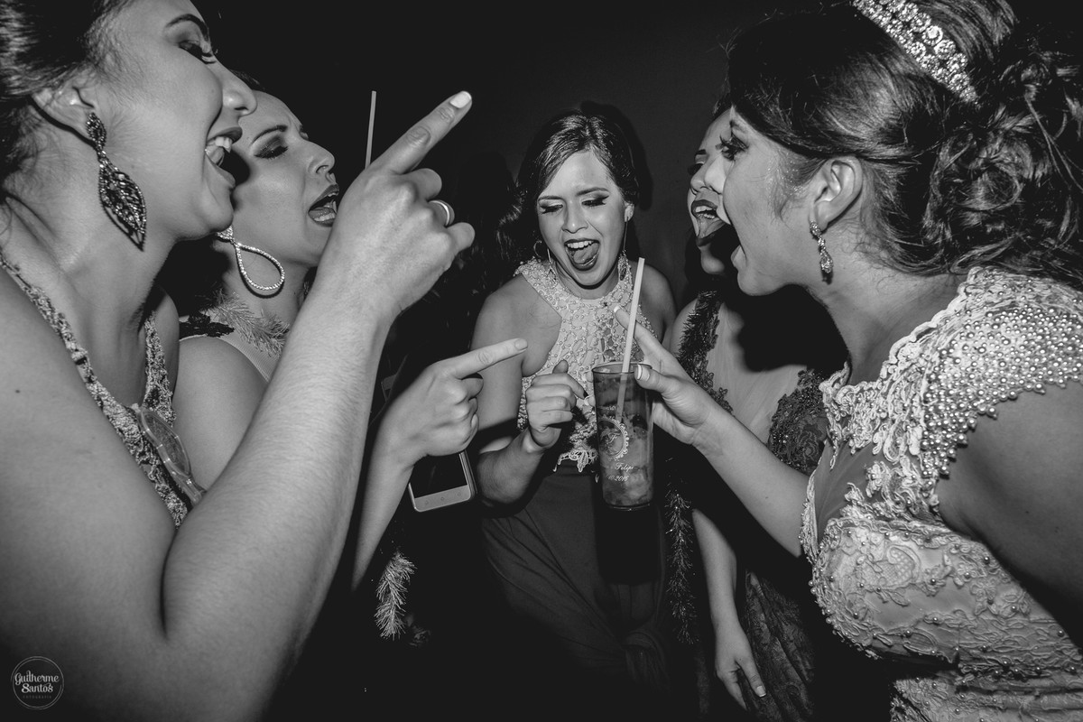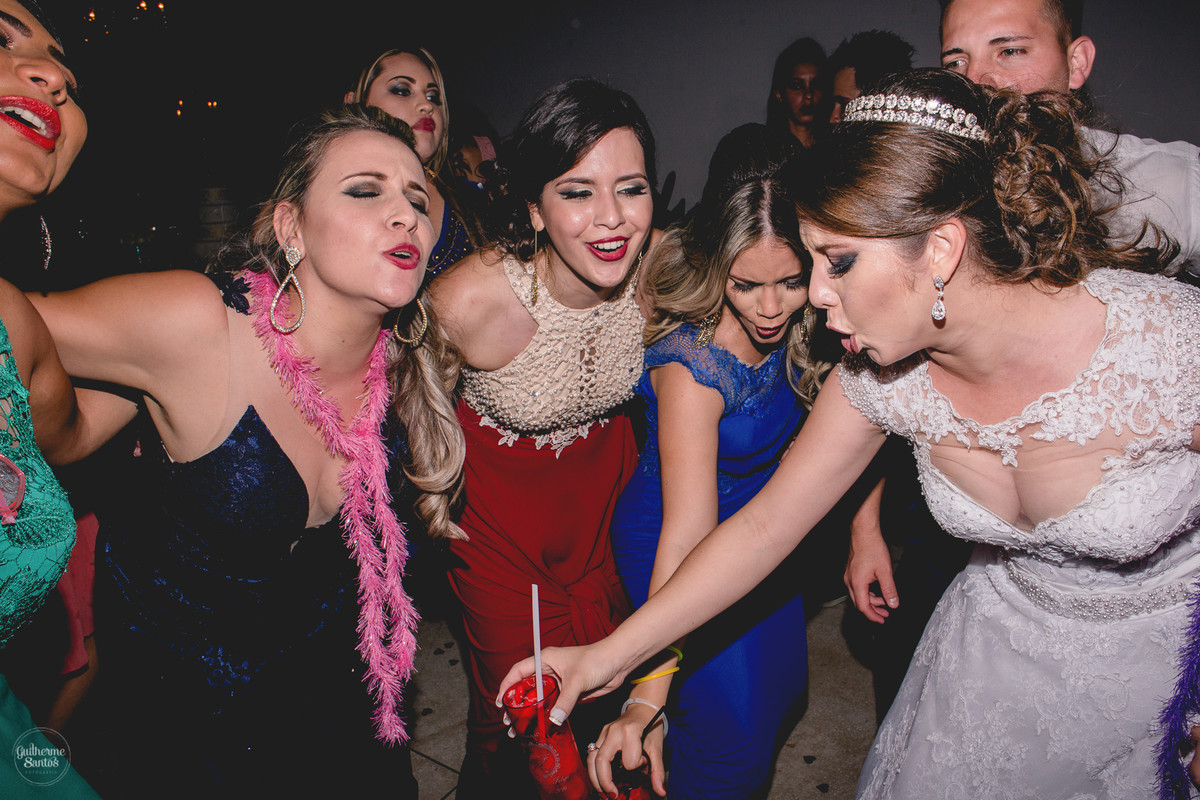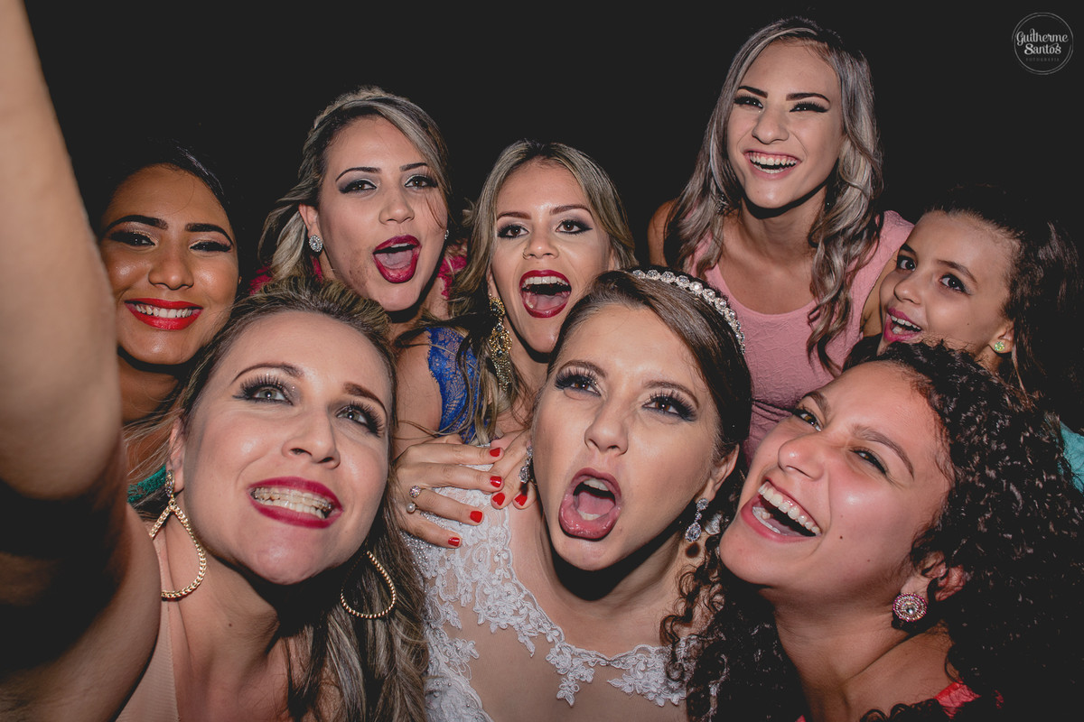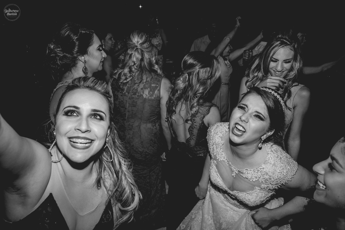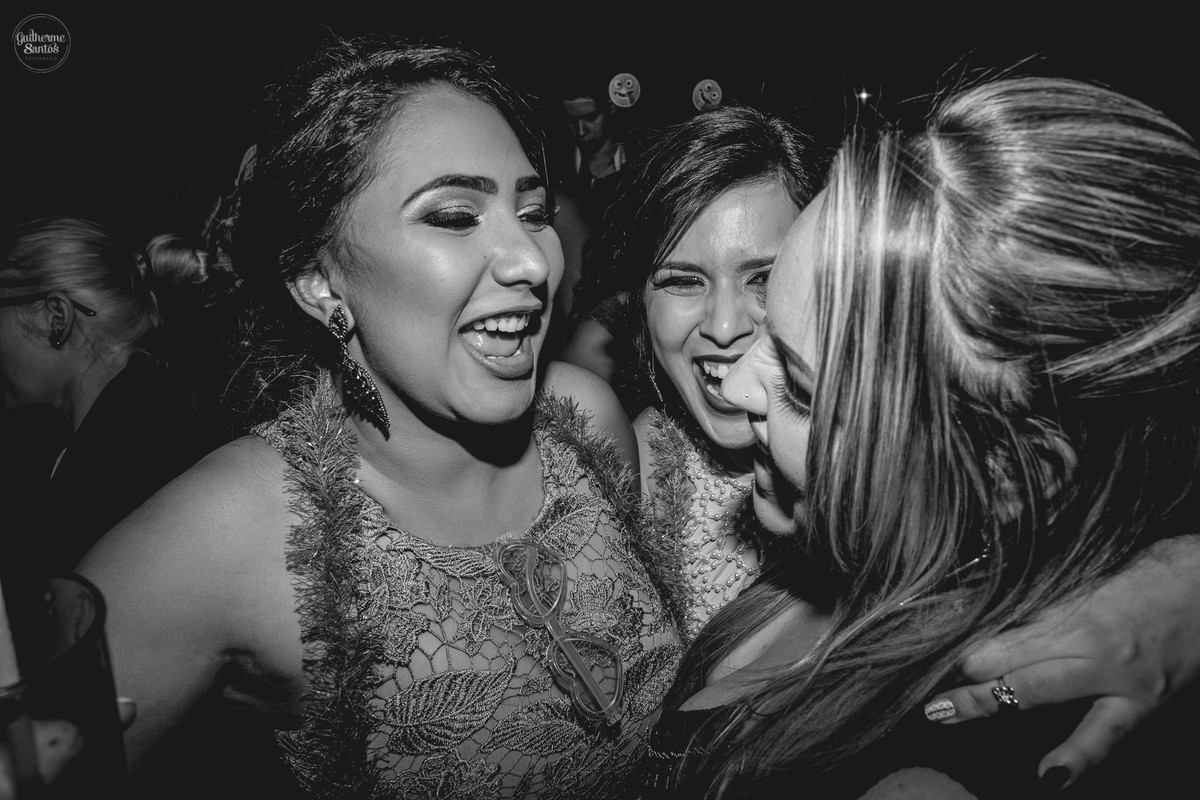 Fotografia de casamento pelo fotógrafo Guilherme Santos, madrinhas brincando e sorrindo esperando a entrada na noiva no casamento