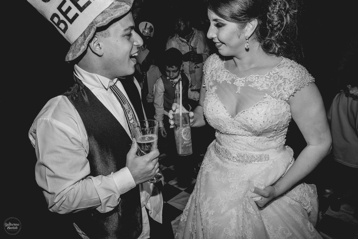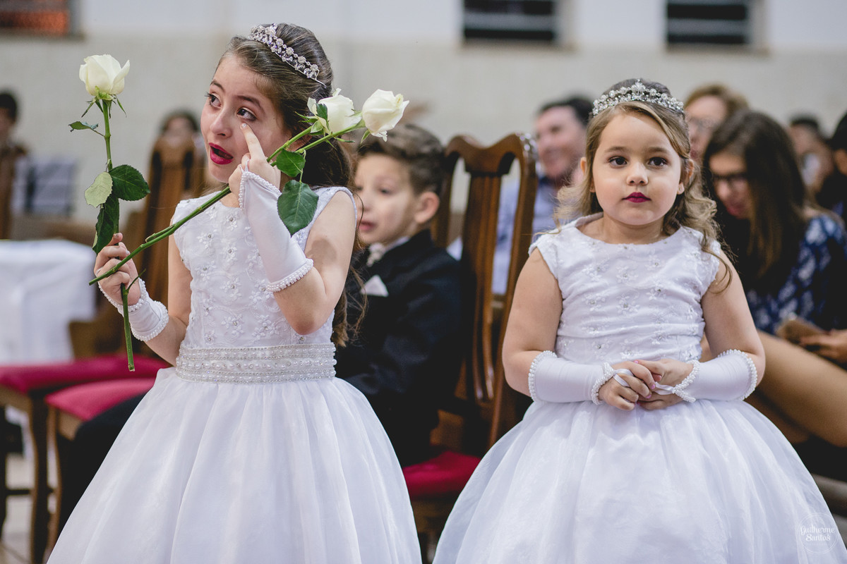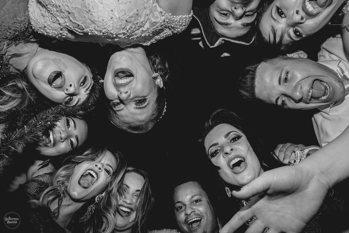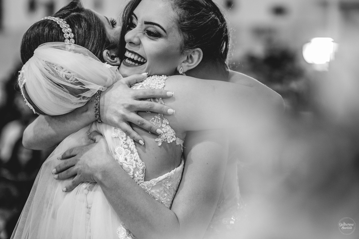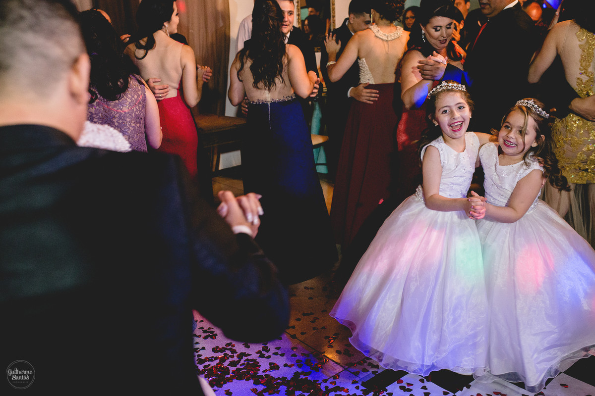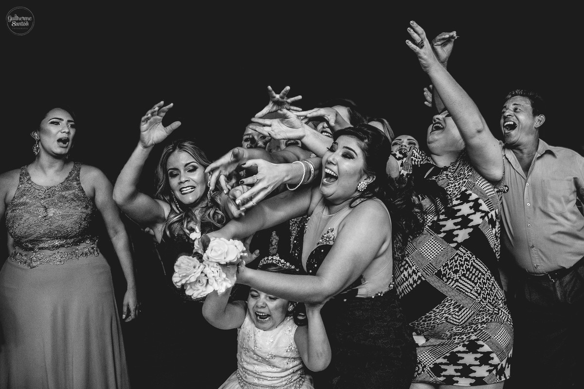 Fotografia de casamento pelo fotógrafo Guilherme Santos, madrinhas brincando e sorrindo esperando a entrada na noiva no casamento