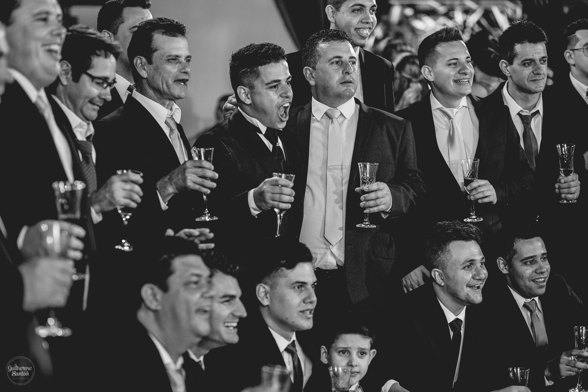 Fotografia de casamento pelo fotógrafo Guilherme Santos, noivo na entrada da igreja com pai e padrinhos sorrindo e curtindo o momento